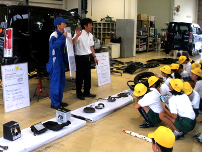 豊橋市の「ユタカ自動車整備豊橋」様では、豊橋市立福岡小学校が社会科の事業の一環として実施した職場体験に協力し、5年生の児童108名を受け入れました。 まず、自動車がたくさんの部品で作られていることを学ぶため、実車から取外した部品を活用し、「走る」、「止まる」、「曲がる」の作用で使う重要な部品の仕組みを手に取って学びました。児童たちは、目の前にある部品が、どんな役割で使っている部品なのかを、熱心に学んでいました。 また、板金についても作業の方法や塗装の方法を学び、実際に修理中の車のボディーを触って、へこみや傷の状態を体感しました。 次に、自動車の販売について児童がお客様となり、新車の注文の流れ体験をしました。ここでは、自動車には様々なオプションがあり、お客様のニーズに合わせたオーダーメイドで発注することを学びました。 その他として、ユタカ自動車整備豊橋様は、自動車免許教習所も併設されているため、運転免許を取得する流れを学んだ後教習風景や教室の見学(救急救命用授業教室、二輪専用コースなど)なども行いました。 執行役員の金田浩和様は、運転免許の取得から自動車の購入・整備まで行なっている自社の幅広い事業を通じて、子供達がクルマ好きになってもらえるように、職場体験に取り組まれています。