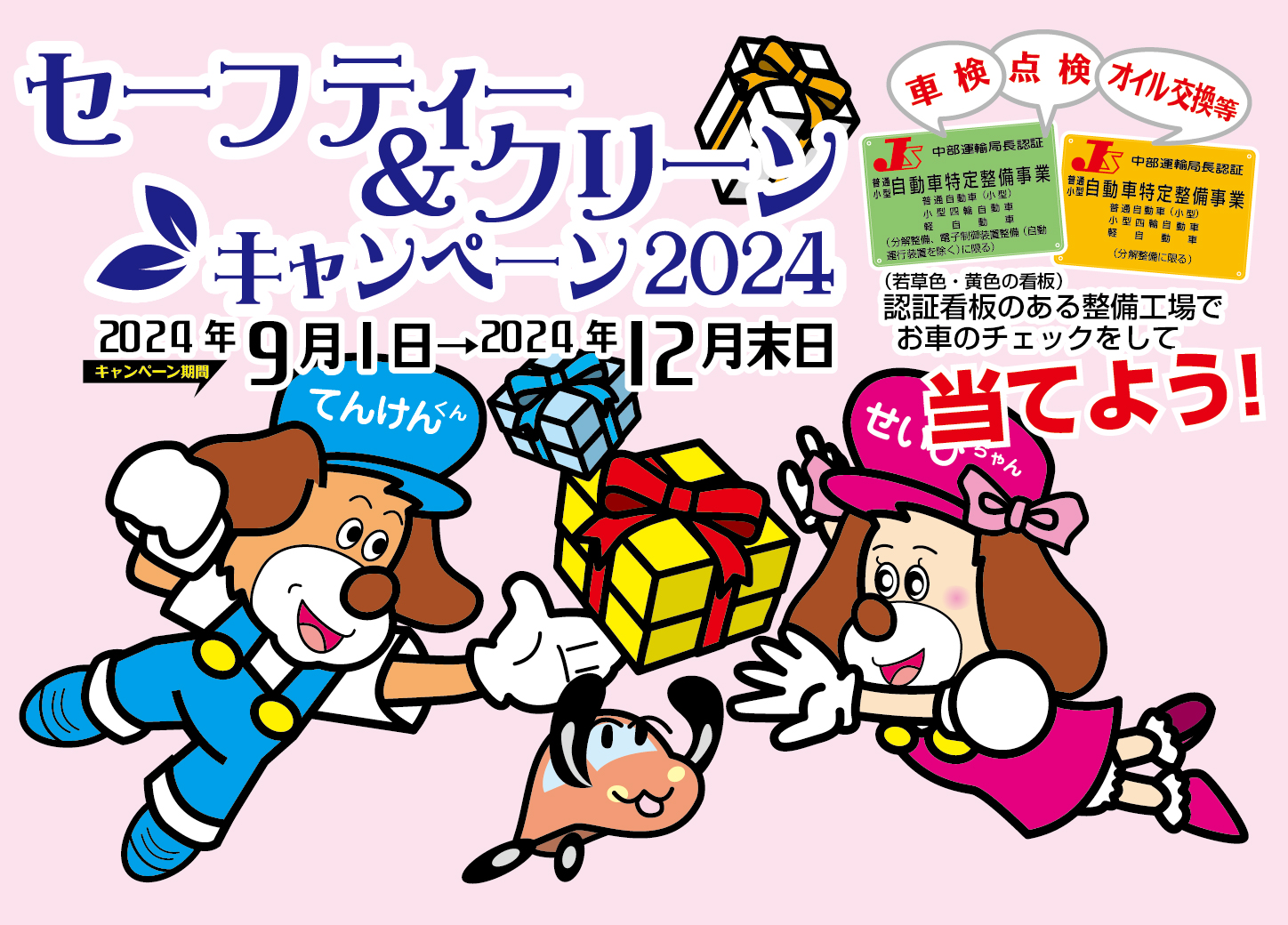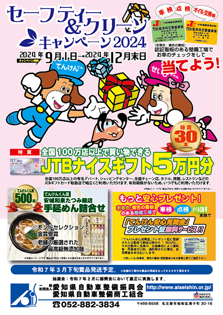 | ※認証看板(若草色・黄色の看板)のある整備工場で期間中「日常点検」「オイル交換」「点検」「整備」「車検」などご利用のお客様に抽選で素敵な賞品があたります。 |