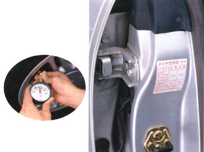 | ●タイヤゲージがあれば、より正確に点検できます。 ●指定空気圧が運転席ドアの端や、センターピラーに貼付されているラベルに表示されています。 ●空気圧が低いと燃費に影響します。 ●ときどき、スペア・タイヤの空気圧も点検します。 |