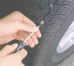 著しい亀裂や損傷がないかをタイヤの全周にわたり点検します。また、釘、石、その他の異物が刺さったり、かみ込んだりしていないかを点検します。 |