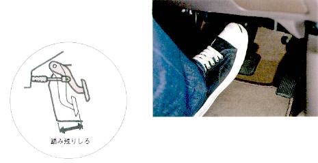 | ブレーキ・ペダルをいっぱいに踏み込んだとき、床板とのすき間(踏み残りしろ)や踏みごたえが適当であるかを点検します。 | |